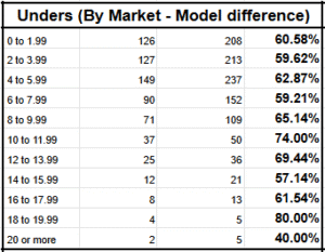 The table above shows the win-rate for each range – the left column is the difference between the model prediction and the market line. As you can see, the win-rate for unders in general is high.
